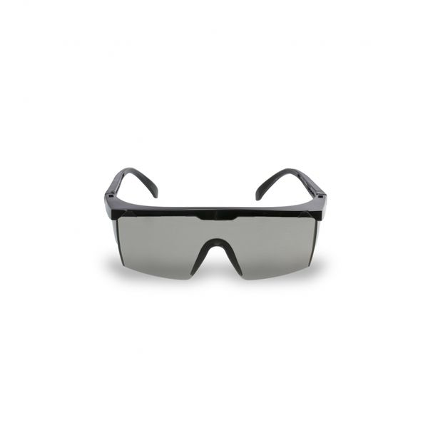 Óculos de proteção, constituídos de arco de material plástico (nylon) com meia-proteção nas bordas, um pino central al?nete e duas fendas nas extremidades da armação utilizadas para o encaixar de visor confeccionado em policarbonato com um furo central para encaixe do pino do arco, apoio nasal e protetor lateral injetado no mesmo material do visor com uma fenda em cada extremidade para o encaixe no arco, hastes do tipo espátula confeccionado do mesmo material que o arco e constituídas de duas peças: semi-haste vazada com uma extremidades presas ao arco por meio de parafuso metálico e outra semi-haste vazada que se encaixa na semi-haste anterior e permite regulagem de tamanho.